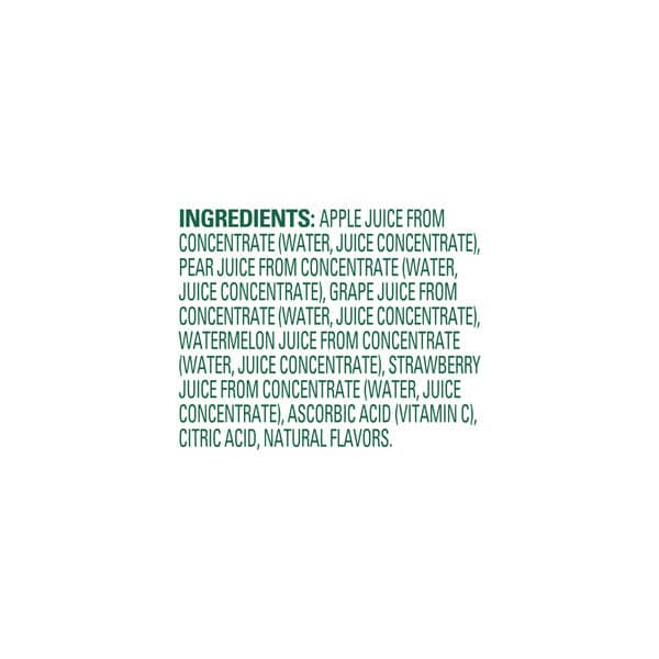 Apple Juice From Concentrate (water, Juice Concentrate), Pear Juice From Concentrate (water, Juice Concentrate), Watermelon Juice From Concentrate (water, Juice Concentrate), Strawberry Juice From Concentrate (water, Juice Concentrate), Ascorbic Acid (vitamin C), Fruit And Vegetable Juice Concentrate (color), Citric Acid, Natural Flavors.