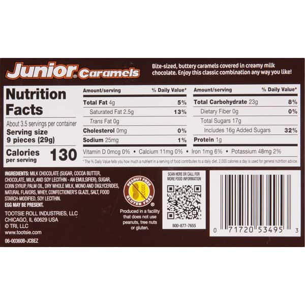 Soft caramels covered in milk chocolate. No artificial flavors or colors. Peanut free. Gluten free. Produced in a facility that does not use peanuts, tree nuts or gluten. Min. 27 pieces. New and improved! Softer caramel and more flavor. Bite-sized, buttery caramels covered in creamy milk chocolate. Enjoy this classic combination any way you like! Product sold by weight not volume. Contents tend to settle after packaging. www.tootsie.com. Scan or call for more food information 800-877-7655.