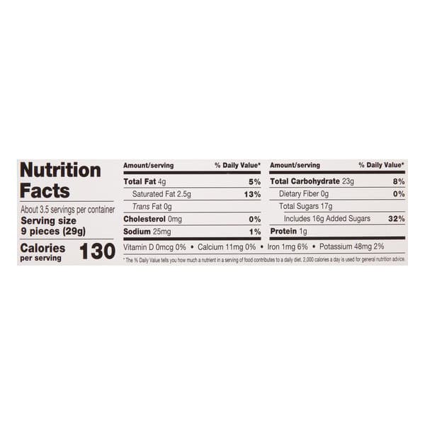 Milk Chocolate (sugar, Cocoa Butter, Chocolate, Milk, And Soy Lecithin – An Emulsifier), Sugar, Corn Syrup, Palm Oil, Dry Whole Milk, Mono And Diglycerides, Natural Flavors, Whey, Confectioner’s Glaze, Salt, Food Starch-modified, Soy Lecithin.