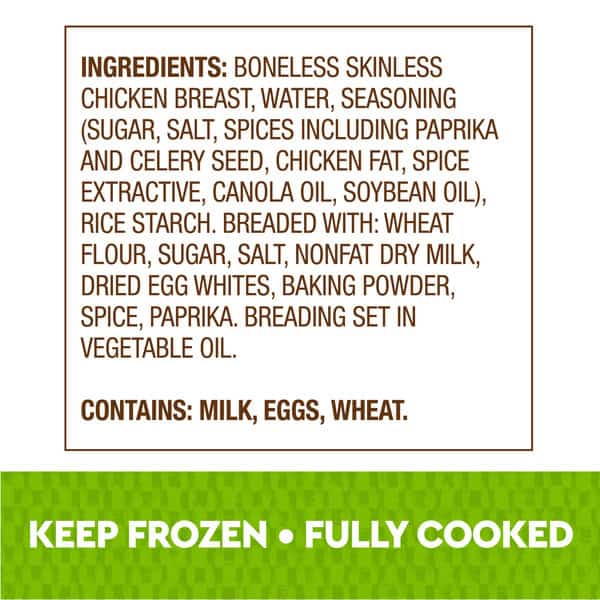 Boneless Skinless Chicken Breast, Water, Seasoning (sugar, Salt, Spices Including Paprika And Celery Seed, Chicken Fat, Spice Extractive, Canola Oil, Soybean Oil), Rice Starch, Breaded With: Wheat Flour, Sugar, Salt, Nonfat Dry Milk, Dried Egg Whites, Baking Powder, Spice, Paprika, Breading Set In Vegetable Oil