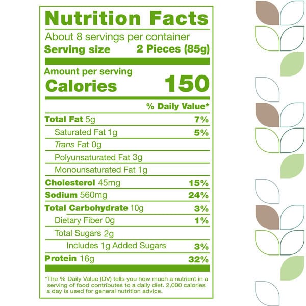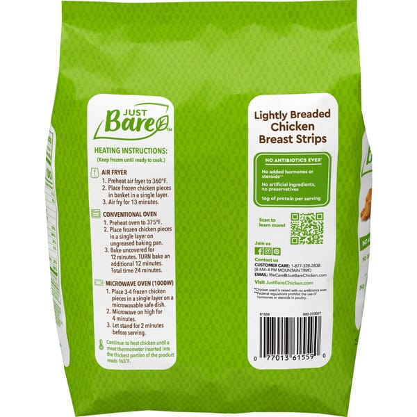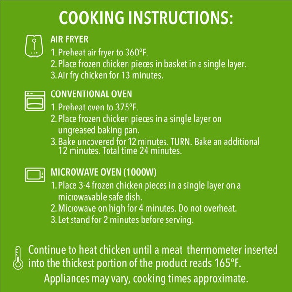 Heating Instructions: (Keep frozen until ready to cook). Air Fryer: 1. Preheat air fryer to 360 degrees F. 2. Place frozen chicken pieces in basket in a single layer. 3. Air fry for 13 minutes. Conventional Oven: 1. Preheat oven to 375 degrees F. 2. Place frozen chicken pieces in a single layer on ungreased baking pan. 3. Bake uncovered for 12 minutes. Turn bake an additional 12 minutes. Total time 24 minutes. Microwave Oven (1000W): 1. Place 3 – 4 frozen chicken pieces in a single layer on a microwavable safe dish. 2. Microwave on high for 4 minutes. 3. Let stand for 2 minutes before serving. Continue to heat chicken until a meat thermometer inserted into the thickest portion of the product reads 165 degrees F.