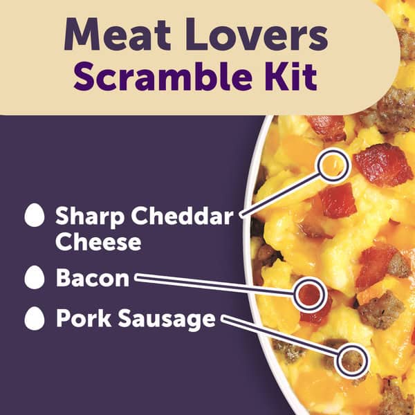 • One 2.25 oz cup of Just Crack an Egg Meat Lovers Scramble Kit with sharp cheddar cheese, pork sausage and bacon