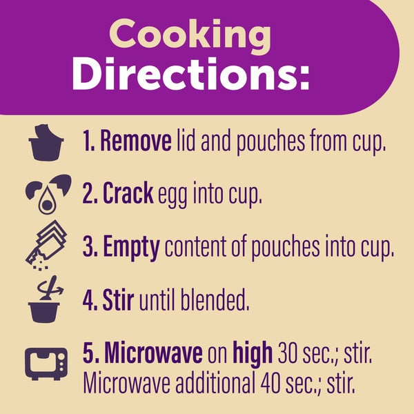 • Crack a fresh egg into the cup, add the contents of the pouches to the cup, stir until blended and microwave according to the instructions