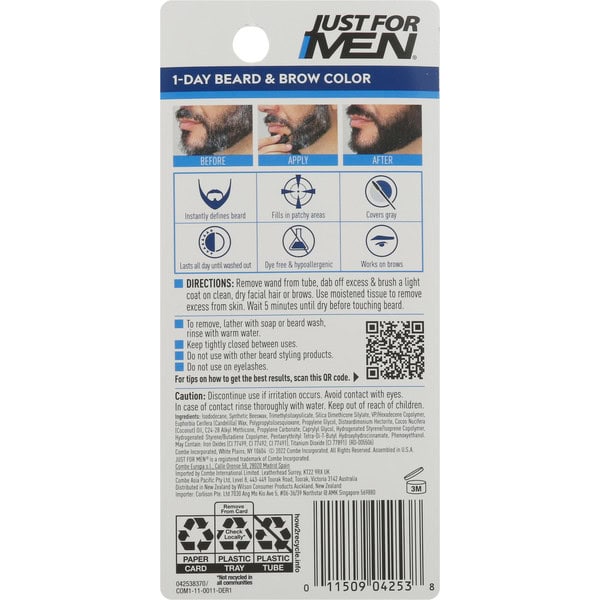 Directions: Remove wand from tube, dab off excess & brush a light coat on clean, dry facial or brows. Use moistened tissue to remove excess from skin. Wait 5 minutes until dry before touching beard. To remove, lather with soap or beard wash, rinse with warm water. Keep tightly closed between uses. Do not use with other beard styling products. Do not use on eyelashes.