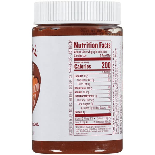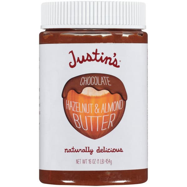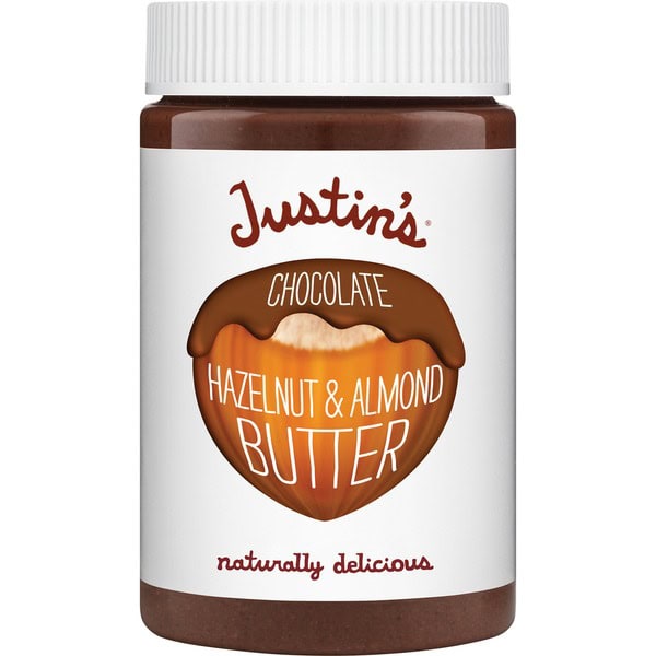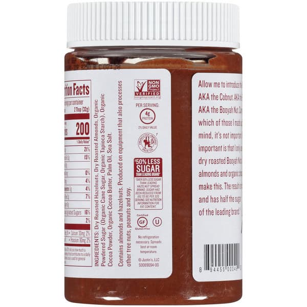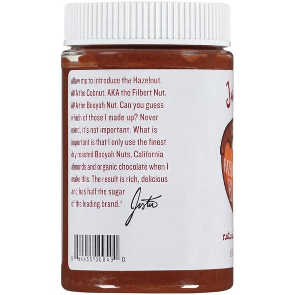 Naturally delicious. Allow me to introduce the Hazelnut. AKA the Cobnut. AKA the Filbert Nut. AKA the Booyah Nut. Can you guess which of those I made up? Never mind, it’s not important. What is important is that I only use the finest dry roasted Booyah Nuts and organic chocolate when I make this. The result is rich, delicious and has half the sugar of the competition. – Justin. 4 g protein. 0 g trans fat. 50% less sugar than leading brand (over 50% less sugar than leading hazelnut spread brand. Sugar has been reduced from 18 g to 7 g per 32 g serving). Gluten free. Vegan. justins.com. BPA free.