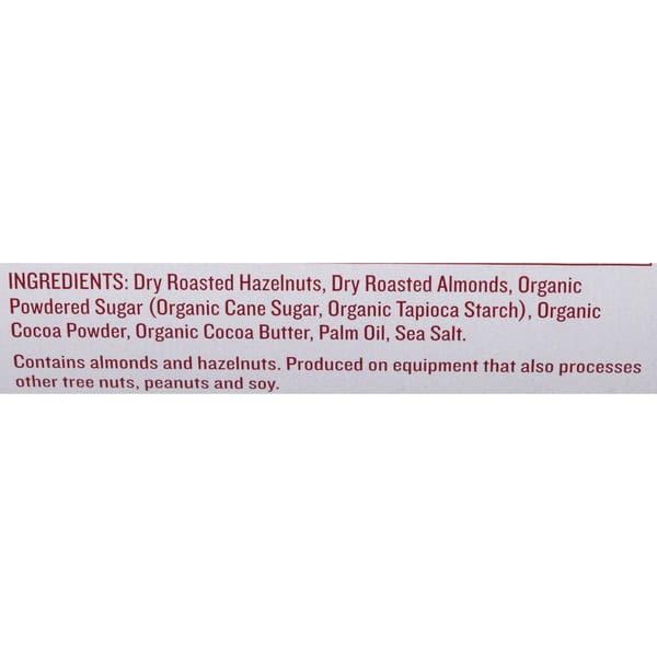 Dry Roasted Hazelnuts, Dry Roasted Almonds, Organic Cane Sugar, Organic Cocoa, Organic Cocoa Butter, Palm Oil, Vanilla Powder, Sea Salt.
