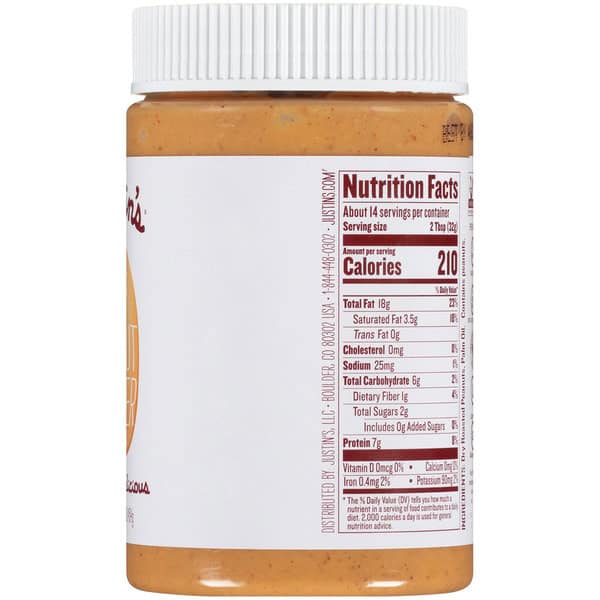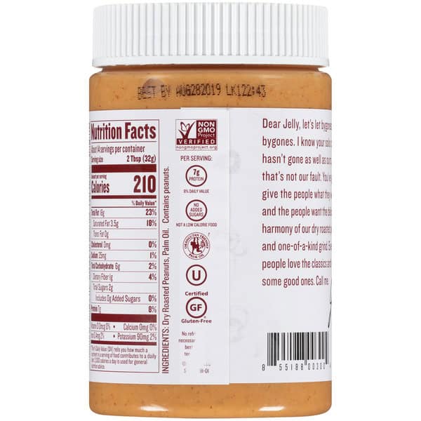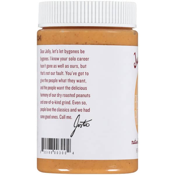 Naturally delicious. Dear Jelly, let’s let bygones be bygones. I know your solo career hasn’t gone as well as ours, but that’s not our fault. You’ve got to give the people what they want, and the people want the delicious harmony of our dry roasted peanuts and one-of-a-kind grind. Even so, people love the classics and we had some good ones. Call me. – Justin. Justins.com. 8 g protein. 2 g fiber. No sugar added. 0 g trans fat. Gluten free. Vegan. No refrigeration necessary. Spreads best at room temperature.