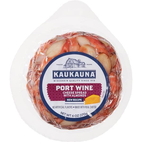 • Wine and cheese are always a good idea, especially when it’s a Kaukauna Port Wine Cheese Ball. Made with real port wine and quality Wisconsin cheddar and covered with almonds, it’s perfect for any dish or cheese plate.