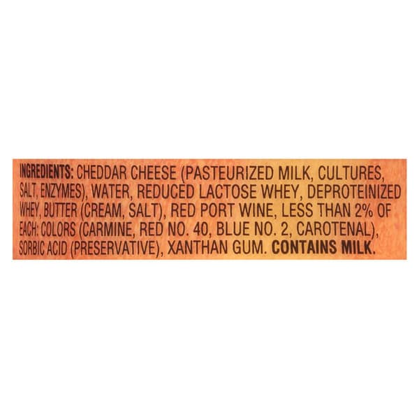 Cheddar Cheese (pasteurized Milk, Cultures, Salt, Enzymes), Water, Reduced Lactose Whey, Deproteinized Whey, Butter (cream, Salt), Red Port Wine, Less Than 2% Of Each: Colors (carmine, Red No. 40, Blue No. 2, Carotenal), Sorbic Acid (preservative), Xanthan Gum