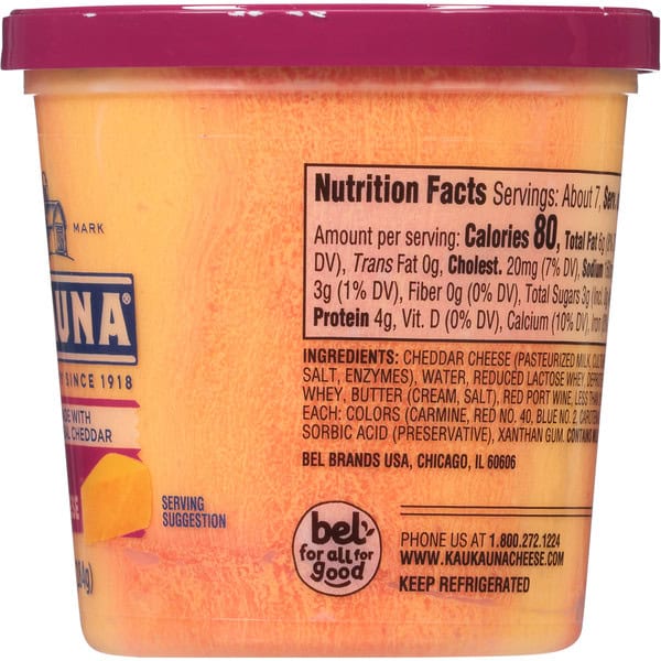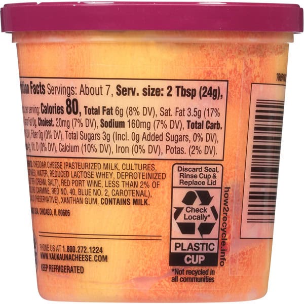 Kaukauna Port Wine Spreadable Cheese is made from quality, aged cheddar cheese, delivering a delicious combination of hearty, robust flavor and velvety texture in a 6.5 ounce resealable cup. Originally created over 100 years ago for Wisconsin Supper Clubs, enjoy Kaukauna today as an easy appetizer, party dip, or even as a snack with crackers. With other flavors to choose from like Sharp Cheddar, Smoky Cheddar, and Extra Sharp, Kaukauna is ideal for any entertaining or snacking occasion!
