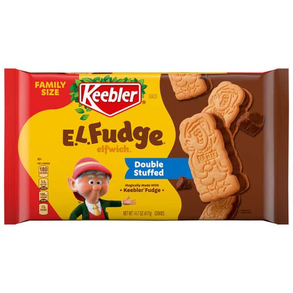 Make snack time more magical with Keebler family size E.L. Fudge Double Stuffed Elfwich Cookies. Crafted by the Elves, each magically baked treat is double-stuffed with crème filling. These sandwich cookies are the pride of the Hollow Tree. No high-fructose corn syrup. It’s a fun snack to share with your family. Enjoy with a glass of milk or ice cream. Just open a pack and share the magic.