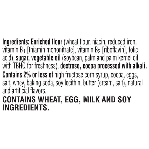 Enriched Flour (wheat Flour, Niacin, Reduced Iron, Vitamin B1 [thiamin Mononitrate], Vitamin B2 [riboflavin], Folic Acid), Sugar, Vegetable Oil (soybean, Palm And Palm Kernel Oil With Tbhq For Freshness), Dextrose, Cocoa Processed With Alkali. Contains 2% Or Less Of High Fructose Corn Syrup, Cocoa, Eggs, Salt, Whey, Baking Soda, Soy Lecithin, Butter (cream, Salt), Natural And Artificial Flavors.