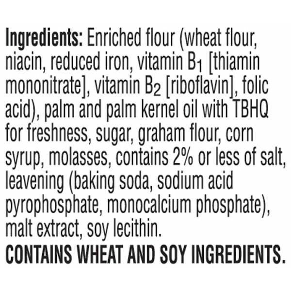 Enriched Flour (wheat Flour, Niacin, Reduced Iron, Vitamin B1 [thiamin Mononitrate], Vitamin B2 [riboflavin], Folic Acid), Palm And Palm Kernel Oil With Tbhq For Freshness, Sugar, Graham Flour, Corn Syrup, Molasses, Contains 2% Or Less Of Salt, Leavening (baking Soda, Sodium Acid Pyrophosphate, Monocalcium Phosphate), Malt Extract, Soy Lecithin