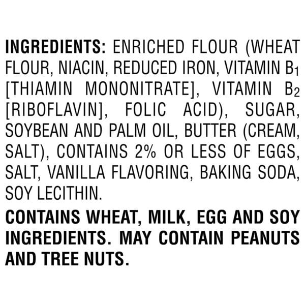 Enriched Flour (wheat Flour, Niacin, Reduced Iron, Vitamin B1 [thiamin Mononitrate], Vitamin B2 [riboflavin], Folic Acid), Sugar, Soybean And Palm Oil, Butter (cream, Salt), Contains 2% Or Less Of Eggs, Salt, Baking Soda, Soy Lecithin.