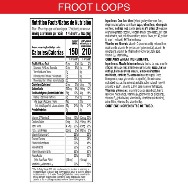 Follow your nose to delicious bursts of fruity flavor in Kellogg’s Froot Loops sweetened multi-grain breakfast cereal. Dig into vibrant, colorful crunchy O’s made with tasty, natural fruit flavors and grains as the first ingredient. It’s like a rainbow in every bowl. Fun to eat for adults and kids, this low-fat, healthy cereal is a good source of 9 vitamins and minerals per serving; The entire family can enjoy a bowl with milk or a dairy alternative in the morning, afternoon or as a late-night treat. Enjoy sweet cereal milk after a delicious bowl of Froot Loops cereal. Perfect for snacking by the handful at work, as a school snack, in the car, and simply on the go. Always have this sweet cereal handy, add fruity goodness to any lunch box, tote bag, or backpack. Any time you want to include a flavorful pick-me-up in your day, reach for a box of Kellogg’s Froot Loops cereal.