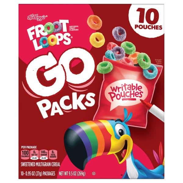 Follow your nose to delicious bursts of fruity flavor and sweetened multi-grain cereal in Kellogg’s Froot Loops Go Packs pouches. These perfectly portioned cereal packs are filled with the tasty goodness of the classic Kellogg’s cereal. It’s like a rainbow in every Go Pack. Dig into vibrant, colorful crunchy O’s made with tasty, natural fruit flavors and grains as the first ingredient. Enjoy a healthy cereal treat right out of the pouch, with or without milk. Feel good about your snacks with this low fat cereal that’s also a good source of 8 vitamins and minerals per serving; These convenient pouches are ready-made for a quick on-the-go breakfast, as simple car snacks, or as an after-game treat. Write a special message on the pouch and encourage your kids for the day ahead! With its delicious taste in an on-the-go pouch, you’ll find the exact same Kellogg’s Froot Loops crunch that’s excellent for everyday moments. Kellogg’s Froot Loops Go Packs are easy to snack on and easy to love.