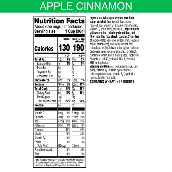 Whole Grain Yellow Corn Flour, Sugar, Enriched Flour (wheat Flour, Niacin, Reduced Iron, Vitamin B₁ [thiamin Mononitrate], Vitamin B₂ [riboflavin], Folic Acid), Degerminated Yellow Corn Flour, Whole Grain Oat Flour, Oat Fiber, Modified Food Starch, Contains 2% Or Less Of Hydrogenated Vegetable Oil (coconut, Soybean And/or Cottonseed), Soluble Corn Fiber, Salt, Natural And Artificial Flavor, Dried Apples, Calcium Carbonate, Apple Juice Concentrate, Cornstarch, Cinnamon, Wheat Starch, Baking Soda, Tricalcium Phosphate, Red 40, Yellow 5, Blue 1, Yellow 6, Bht For Freshness, Vitamins And Minerals: Iron, Niacinamide, Zinc Oxide, Vitamin B₁ (thiamin Hydrochloride), Calcium Pantothenate, Vitamin B₆ (pyridoxine Hydrochloride), Folic Acid