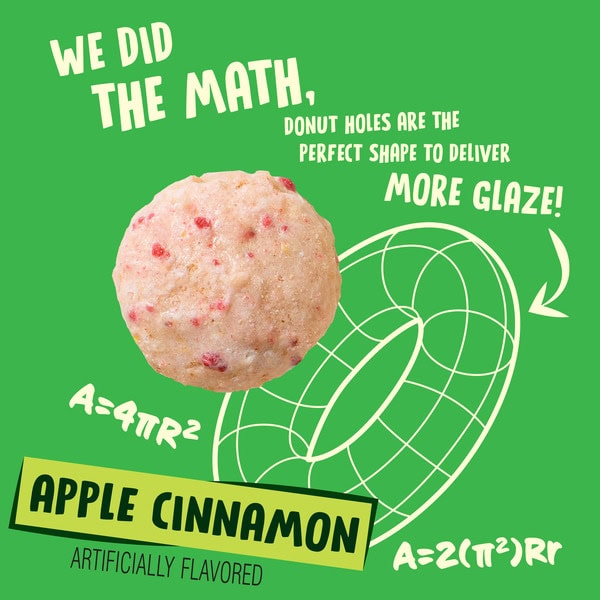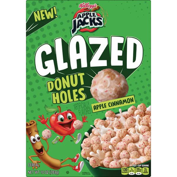 Donut lovers, we’re giving Kellogg’s Apple Jacks Glazed Donut Holes cereal a glaze up. These sweet, crispy, donut-hole shapes will blow up your breakfast game with their apple cinnamon flavored crunch and sweet glaze, made especially for fans of Kellogg’s Apple Jacks. This cereal is a crossover of fun with the fan-favorite Apple Jacks flavor you love in a crispy round shape with a shiny glaze that adds a sweet flavor to every bite; Pour these crunchy little pieces into a bowl and slurp up the tasty donut-flavored milk. Max glaze equals max flavor, so that’s why we added the melt-in-your-mouth glaze on every single donut-inspired bite. We did the math, and donut holes are the perfect shape to deliver more deliciousness. Wake up those sleepy mornings with a bowl before school for an easy breakfast win or eat them right out of the box. Kellogg’s Apple Jacks Glazed Donut Holes cereal is a slam dunk to kick off your morning with an apple cinnamon boost. Do-nut miss this yummy breakfast!