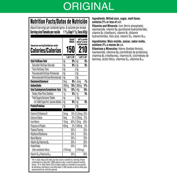 Milled Corn, Sugar, Malt Flavor, Contains 2% Or Less Of Salt. Vitamins And Minerals: Iron (ferric Phosphate), Niacinamide, Vitamin B6 (pyridoxine Hydrochloride), Vitamin B2 (riboflavin), Vitamin B₁ (thiamin Hydrochloride), Folic Acid, Vitamin D3, Vitamin B12.