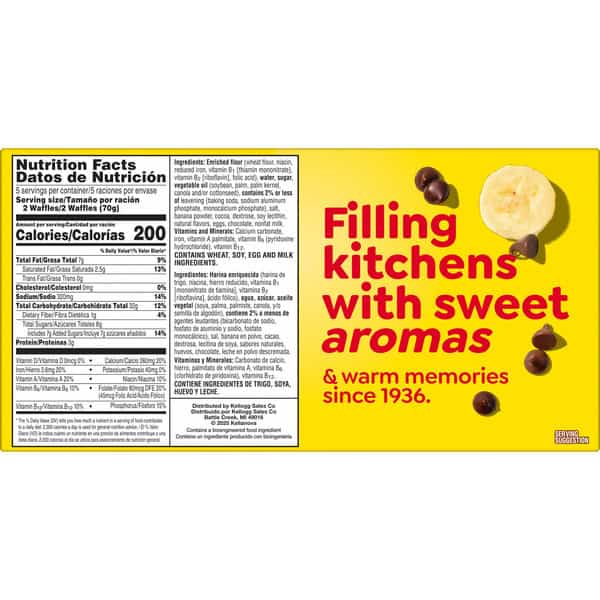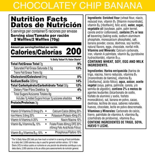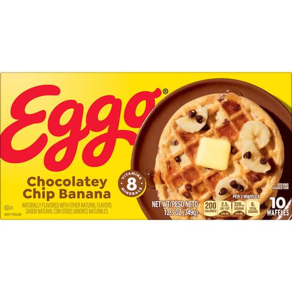Wake up and greet the day with a classic! Eggo Chocolatey Chip Banana waffles are crispy-on-the-outside and fluffy-on-the-inside – just the way you remember them. Crafted with delicious ingredients and the yummy taste of chocolatey chips and bananas, these frozen waffles couldn’t be easier to make. Pop them in the toaster or oven for a delightfully crisp texture and familiar, inviting homemade taste. Feel good about what you’re serving your family; 2 waffles provide a good source of 8 vitamins and minerals. These scrumptious waffles are made to enjoy as part of a balanced breakfast. They help bring warmth and smiles to a fast-paced, busy morning or make a great addition to a relaxed weekend brunch. They’ve been filling kitchens with sweet aromas and warm memories for decades. Try them with your favorite toppings such as butter and syrup, jelly or jam, fresh fruit, whipped cream, or powdered sugar. No matter how you top ’em, it’s always an “mmmmm” moment. They’re just so delicious, why would you L’Eggo your Eggo?