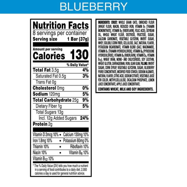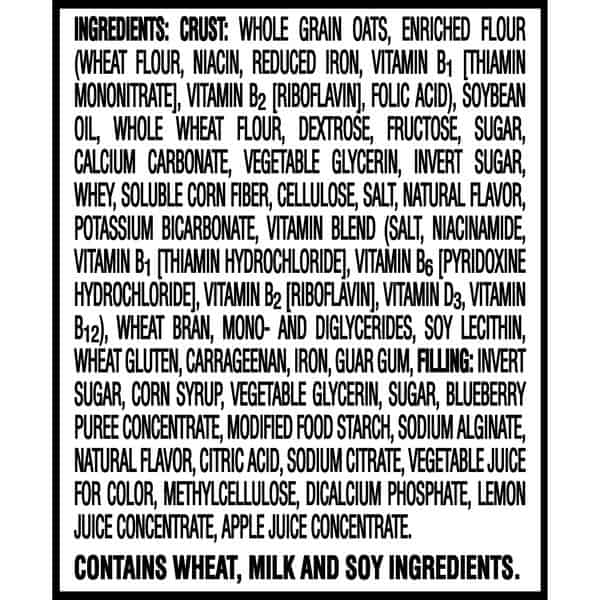 Crust: Whole Grain Oats, Enriched Flour (wheat Flour, Niacin, Reduced Iron, Vitamin B₁ [thiamin Mononitrate], Vitamin B₂ [riboflavin], Folic Acid), Soybean Oil, Whole Wheat Flour, Sugar, Dextrose, Fructose, Calcium Carbonate, Vegetable Glycerin, Invert Sugar, Whey, Soluble Corn Fiber, Salt, Cellulose, Natural Flavor, Potassium Bicarbonate, Vitamin And Mineral Blend (salt, Niacinamide, Reduced Iron, Zinc Oxide, Vitamin A Palmitate, Vitamin B₁ [thiamin Hydrochloride], Vitamin B₆ [pyridoxine Hydrochloride], Vitamin B₂ [riboflavin]), Wheat Bran, Mono- And Diglycerides, Soy Lecithin, Wheat Gluten, Carrageenan, Guar Gum, Filling: Invert Sugar, Corn Syrup, Blueberry Puree Concentrate, Vegetable Glycerin, Sugar, Modified Food Starch, Sodium Alginate, Natural Flavor, Citric Acid, Sodium Citrate, Vegetable Juice For Color, Methylcellulose, Dicalcium Phosphate, Malic Acid, Apple Juice Concentrate