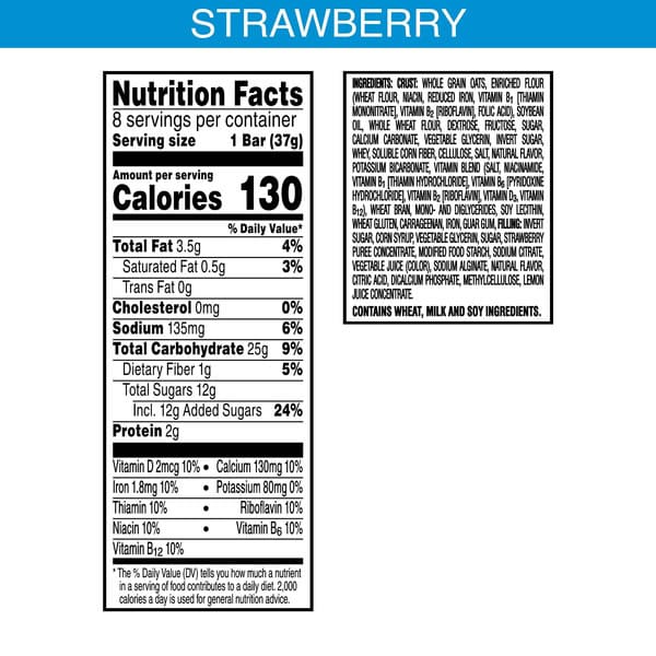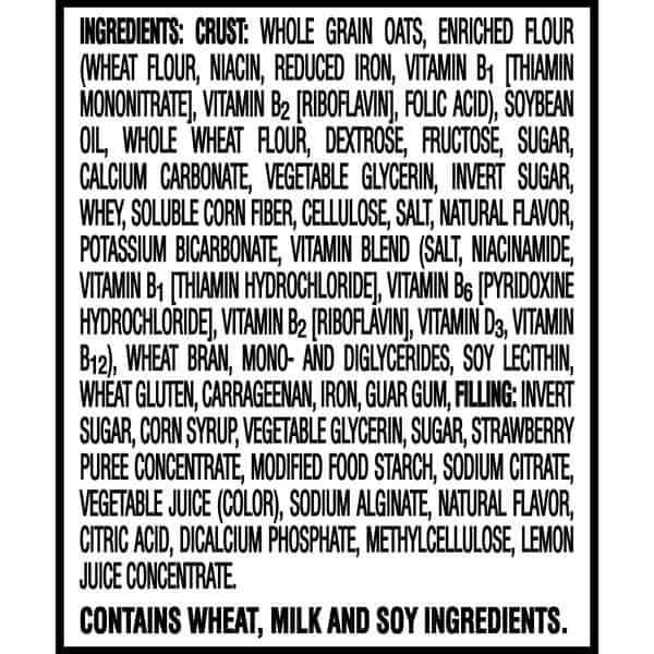 Crust: Whole Grain Oats, Enriched Flour (wheat Flour, Niacin, Reduced Iron, Vitamin B₁ [thiamin Mononitrate], Vitamin B₂ [riboflavin], Folic Acid), Soybean Oil, Whole Wheat Flour, Sugar, Dextrose, Fructose, Calcium Carbonate, Vegetable Glycerin, Invert Sugar, Whey, Soluble Corn Fiber, Salt, Cellulose, Natural Flavor, Potassium Bicarbonate, Vitamin And Mineral Blend (salt, Niacinamide, Reduced Iron, Zinc Oxide, Vitamin A Palmitate, Vitamin B₁ [thiamin Hydrochloride], Vitamin B₆ [pyridoxine Hydrochloride], Vitamin B₂ [riboflavin]), Wheat Bran, Mono- And Diglycerides, Soy Lecithin, Wheat Gluten, Carrageenan, Guar Gum, Filling: Invert Sugar, Corn Syrup, Strawberry Puree Concentrate, Vegetable Glycerin, Sugar, Vegetable Juice For Color, Modified Food Starch, Sodium Citrate, Sodium Alginate, Citric Acid, Natural Flavor, Dicalcium Phosphate, Methylcellulose, Malic Acid