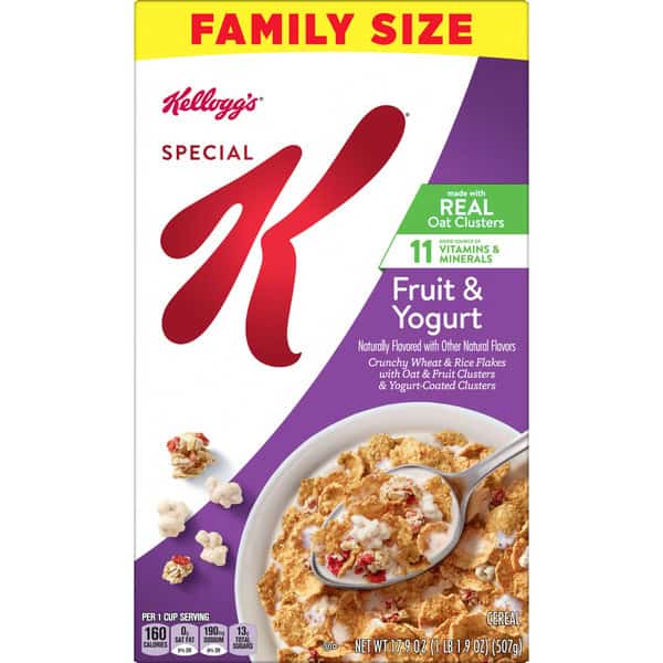 Do what’s delicious with Special K Fruit and Yogurt. Crisp rice and wheat flakes made with real oat clusters with fruit and yogurt help you stay on track for the day ahead. Nutritious and delicious, every bowl provides a good source of 11 vitamins and minerals. Made with fiber, B vitamins, and iron, plus Vitamins A, C, and E as antioxidants women need (beta-carotene (source of vitamin A)); Make it an irresistible, low-fat part of a quick breakfast, lunch, dinner or late-night snack. Try it as a work day or between-meal treat. Enjoy this healthy cereal with dairy or nut-milk. Add it to your favorite yogurt, smoothie, or trail mix recipe. Whether you enjoy your cereal at home, work, school, or the gym, you’ll love the sweet and satisfying taste. Kids and adults both love the taste of real oat clusters with fruit and yogurt paired with your favorite milk. Morning time or any time, Kellogg’s Special K Fruit and Yogurt cereal is a flavorful choice the whole family can feel good about.