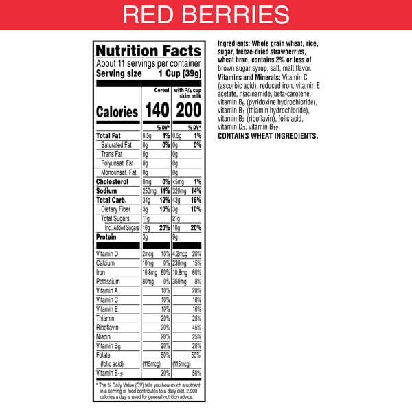 Whole Grain Wheat, Rice, Sugar, Freeze-dried Strawberries, Wheat Bran, Contains 2% Or Less Of Brown Sugar Syrup, Salt, Malt Flavor, Vitamins And Minerals: Vitamin C (ascorbic Acid), Reduced Iron, Vitamin E Acetate, Niacinamide, Beta-carotene, Vitamin B₆ (pyridoxine Hydrochloride), Vitamin B₁ (thiamin Hydrochloride), Vitamin B₂ (riboflavin), Folic Acid, Vitamin D₃, Vitamin B₁₂
