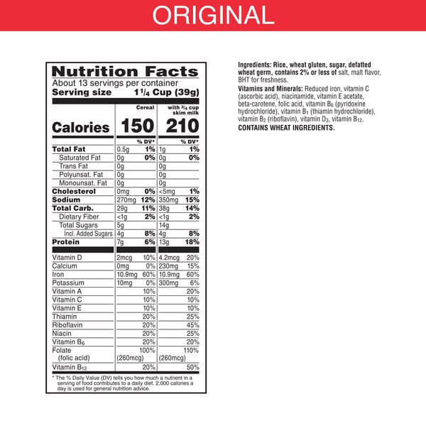 Rice, Wheat Gluten, Sugar, Defatted Wheat Germ, Contains 2% Or Less Of Salt, Malt Flavor, Bht For Freshness, Vitamins And Minerals: Reduced Iron, Vitamin C (ascorbic Acid), Niacinamide, Vitamin E Acetate, Beta-carotene, Folic Acid, Vitamin B6 (pyridoxine Hydrochloride), Vitamin B1 (thiamin Hydrochloride), Vitamin B2 (riboflavin), Vitamin D3, Vitamin B12