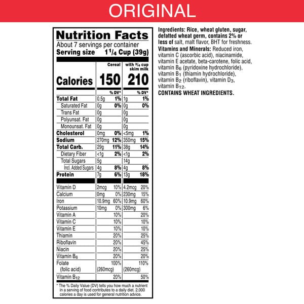 Rice, Wheat Gluten, Sugar, Defatted Wheat Germ, Contains 2% Or Less Of Salt, Malt Flavor, Bht For Freshness, Vitamins And Minerals: Reduced Iron, Vitamin C (ascorbic Acid), Niacinamide, Vitamin E Acetate, Beta-carotene, Folic Acid, Vitamin B₆ (pyridoxine Hydrochloride), Vitamin B₁ (thiamin Hydrochloride), Vitamin B₂ (riboflavin), Vitamin D₃, Vitamin B₁₂