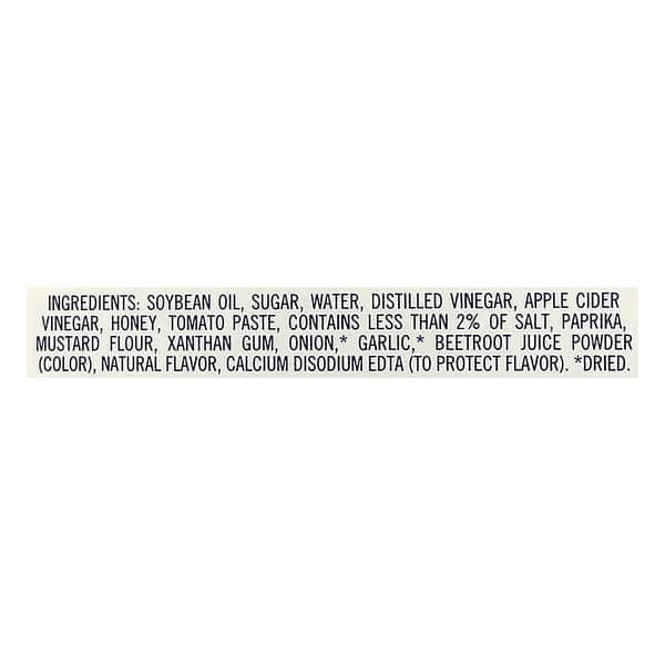 Oybean Oil, Sugar, Water, Distilled Vinegar, Apple Cider Vinegar, Honey, Tomato Paste, Contains Less Than 2% Of Salt, Paprika, Mustard Flour, Xanthan Gum, Onion,* Garlic,* Beetroot Juice Powder (color), Natural Flavor, Calcium Disodium Edta (to Protect Flavor).