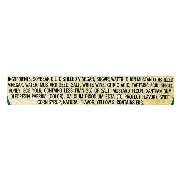 Soybean Oil, Distilled Vinegar, Sugar, Water, Dijon Mustard (distilled Vinegar, Water, Mustard Seed, Salt, White Wine, Citric Acid, Tartaric Acid, Spice), Honey, Egg Yolk, Contains Less Than 2% Of Salt, Mustard Flour, Xanthan Gum, Oleoresin Paprika (color), Calcium Disodium Edta (to Protect Flavor), Spice, Corn Syrup, Natural Flavor, Yellow 5.