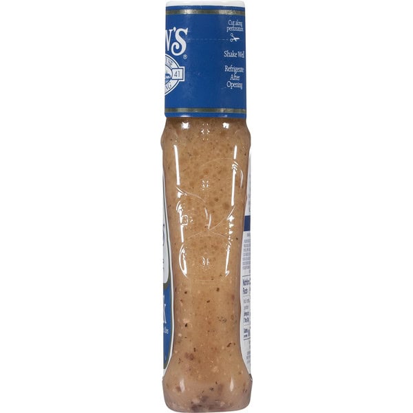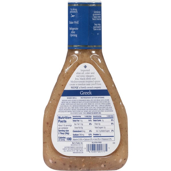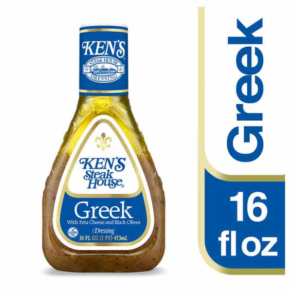 Ken’s Steak House Greek Salad Dressing has a distinct blend of imported olive oil, cider, red wine vinegars, genuine feta, black olives, and Mediterranean-inspired spices creating a taste that’s both exotic and timeless. Enjoy on any green or pasta salad. Delicious when drizzled on a crusty-roll deli sandwich. Marinate beef, chicken, or fish before grilling for that authentic Greek taverna taste.