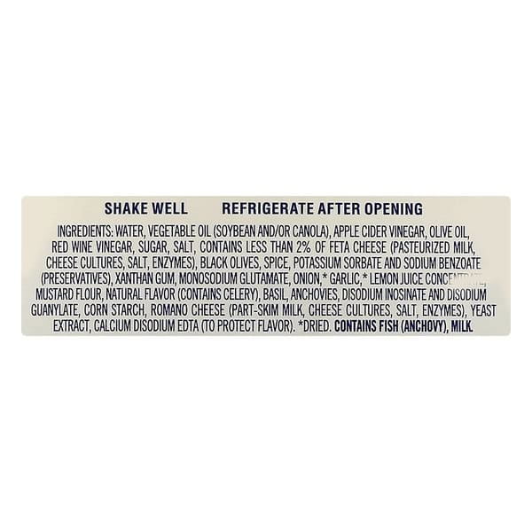 Water, Vegetable Oil (soybean And/or Canola), Apple Cider Vinegar, Olive Oil, Red Wine Vinegar, Sugar, Salt, Contains Less Than 2% Of Feta Cheese (pasteurized Milk, Cheese Cultures, Salt, Enzymes), Chopped Black Olives (black Olives, Water, Vinegar, Salt, Lactic Acid, Ferrous Gluconate [color Stabilizer]), Spice, Xanthan Gum, Monosodium Glutamate, Onion,* Garlic,* Lemon Juice Concentrate, Mustard Flour, Garlic, Onion, Natural Flavors (contains Celery), Basil, Potassium Sorbate And Sodium Benzoate (preservatives), Anchovies, Disodium Inosinate And Disodium Guanylate, Corn Starch, Romano Cheese (pasteurized Part-skim Milk, Cheese Cultures, Salt, Enzymes), Whey, Autolyzed Yeast Extract, Calcium Disodium Edta (to Protect Flavor).