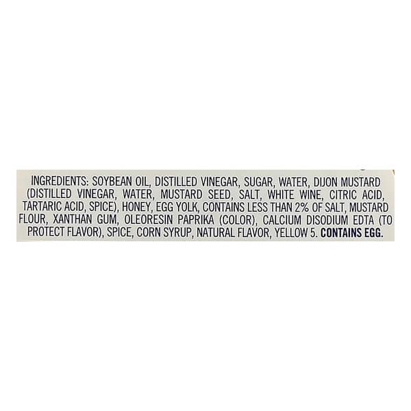Soybean Oil, Distilled Vinegar, Sugar, Water, Dijon Mustard (distilled Vinegar, Water, Mustard Seed, Salt, White Wine, Citric Acid, Tartaric Acid, Spice), Honey, Egg Yolk, Contains Less Than 2% Of Salt, Mustard Flour, Xanthan Gum, Oleoresin Paprika (color), Calcium Disodium Edta (to Protect Flavor), Spice, Corn Syrup, Natural Flavor, Yellow 5.