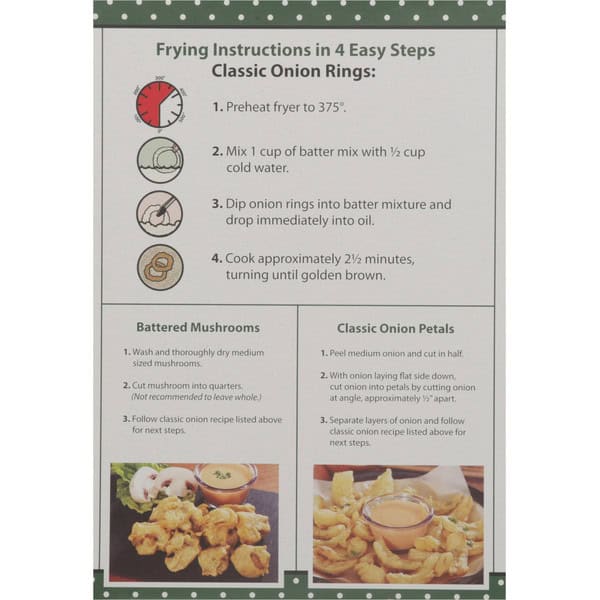Frying Instructions in 4 Easy Steps: Classic Onion Rings: 1. Preheat fryer to 375 degrees. 2. Mix 1 cup of batter mix with 1/2 cup cold water. 3. Dip onion rings into batter mixture and drop immediately into oil. 4. Cook approximately 2-1/2 minutes, turning until golden brown.