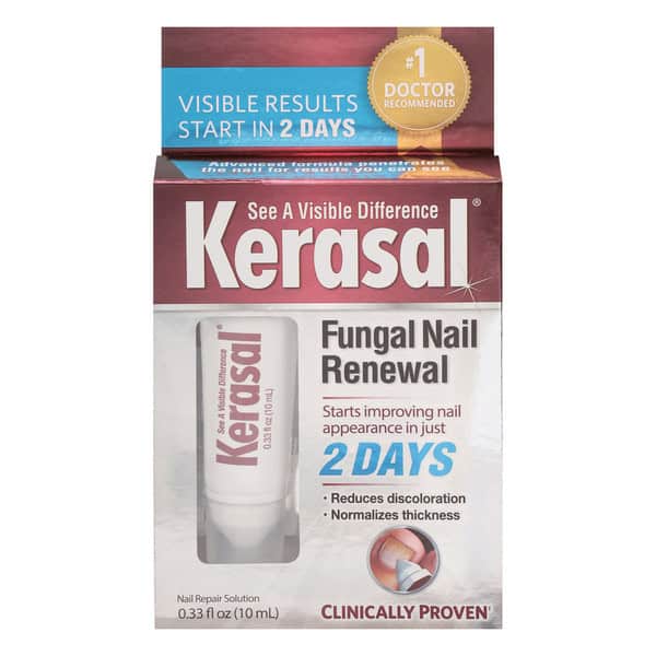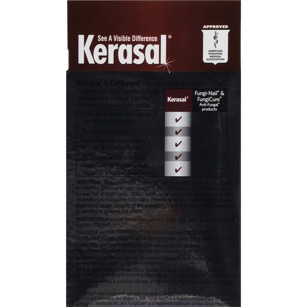 No.1 doctor recommended (2018 Podiatrist Recommendation Study, data on file: Results based on brand most often recommended to patients for improving the appearance of nails damaged by a fungal infection). Visible results starts in 2 days. See a visible difference. Starts improving nail appearance in just 2 days. Reduces discoloration. Normalizes thickness. Clinically proven (Over 90% of people in a clinical trial saw a visible improvement after 8 weeks when used as directed). Advanced formula penetrates the nail for results you can see. Kerasal is Different – It is specifically formulated improve the appearance of nails damaged by fungus. See the difference Kerasal can make. Delivers a visible difference starting in just 2 days. Penetrates the nail. Improves nail appearance in over 90% of sufferers. Approved by the American Podiatric Medical Association. Fungi-Nail & FungiCure Anti-Fungal (Fungi-Nail and FungiCure®are only intended to be applied to the skin, not the nail, to treat skin fungal infections like athlete’s foot. Fung-Nail is a registered trademark of Arcadia Consumer Healthcare Inc. and FungiCure is a registered trademark of Alva-Amco Pharmacal Inc.) products. Proven safe. Precision, no-mess silicone tip applicator. Odorless. Preservative free. 3-month supply for up to 3 nails.