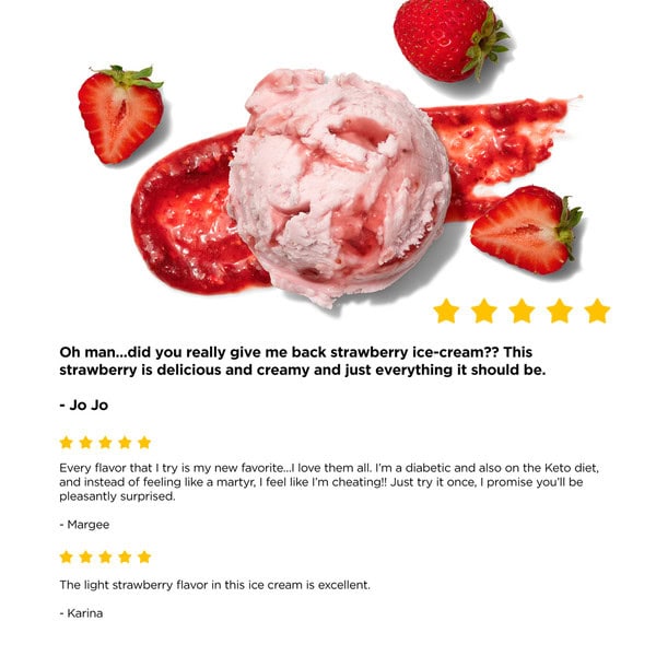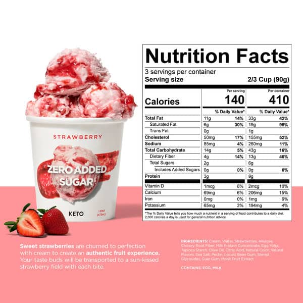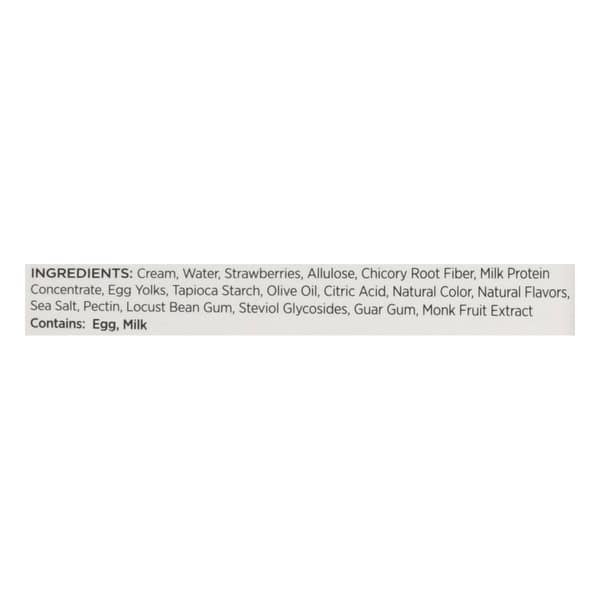 Cream, Water, Strawberry Base (strawberries, Fruit Juice (for Color), Citric Acid), Egg Yolks, Erythritol, Non-gmo Chicory Root Fiber, Milk Protein Concentrate, Vegetable Glycerine, Sea Salt, Non-gmo Guar Gum, Stevia, Monk Fruit, Non-gmo Gum Acacia.