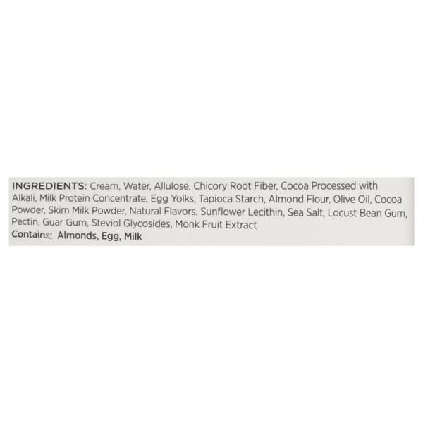 Cream, Water, Egg Yolks, Erythritol, Chocolate Chips (unsweetened Chocolate, Erythritol, Cocoa Butter, Stevia, Sunflower Lecithin), Non-gmo Chicory Root Fiber, Cocoa (processed With Alkali), Milk Protein Concentrate, Vegetable Glycerine, Sea Salt, Non-gmo Guar Gum, Stevia, Monk Fruit, Non-gmo Gum Acacia.