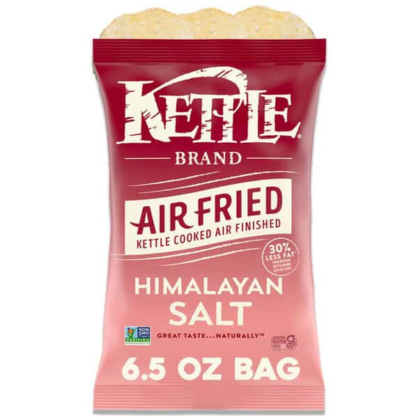 Kettle Brand Air Fried Himalayan Salt Kettle Chips are kettle cooked, air-fried chips that deliver a light and crispy crunch with no compromise on taste and texture. Sprinkled with a kiss of Himalayan pink salt, these chips have 100% bold Kettle Brand flavor with 30% less fat and a lighter texture than our regular Kettle Brand Sea Salt Chips. When you open a bag of our Kettle Brand potato chips, you know you’re getting incredible kettle chips made with authentic recipes by real people. From their farms to our kitchens and then to your home, the time and attention every Kettle Brand worker puts into their products is care you can trust. All that, plus Kettle Brand Air Fried chips deliver a delicious snack that’s Non-GMO Project Verified and Certified Gluten Free. This 6.5-ounce bag of chips is perfect for sharing at parties, tailgates, or just snacking on the couch.