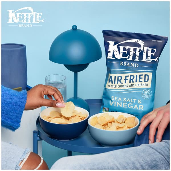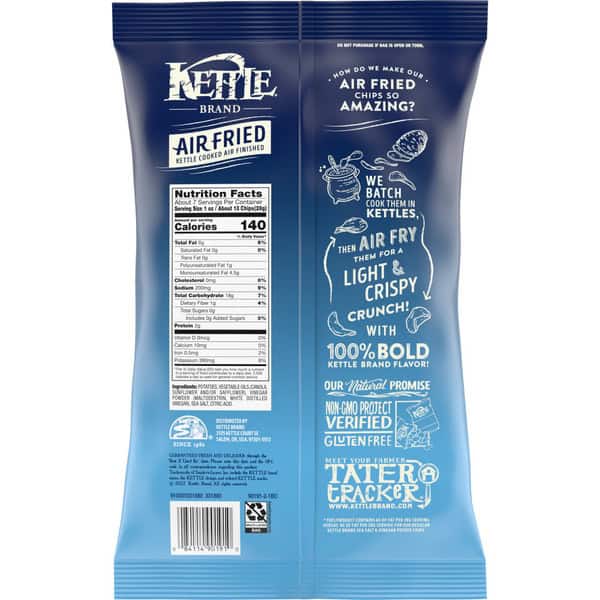 Kettle Brand Air Fried Sea Salt & Vinegar Kettle Chips are kettle cooked, air-fried chips that delivers a light and crispy crunch with no compromise on taste and texture. Their balanced flavor of sea salt and tongue-puckering vinegar deliver 100% bold Kettle Brand flavor with 30% less fat than our regular Kettle Brand Sea Salt & Vinegar Chips. Delight your taste buds with our take on this flavorful favorite. When you open a bag of our Kettle Brand potato chips, you know you’re getting incredible kettle chips made with authentic recipes by real people. From their farms to our kitchens and then to your home, the time and attention every Kettle Brand worker puts into their products is care you can trust. All that, plus Kettle Brand Air Fried chips deliver a delicious snack that’s Non-GMO Project Verified and Certified Gluten Free. This 6.5-ounce bag of chips is perfect for sharing at parties, tailgates, or just snacking on the couch.