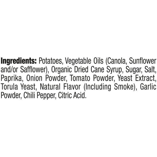 Potatoes, Vegetable Oils (canola, Sunflower And/or Safflower), Organic Dried Cane Syrup, Sugar, Salt, Paprika, Onion Powder, Tomato Powder, Yeast Extract, Torula Yeast, Natural Flavor (including Smoke), Garlic Powder, Chili Pepper, Citric Acid