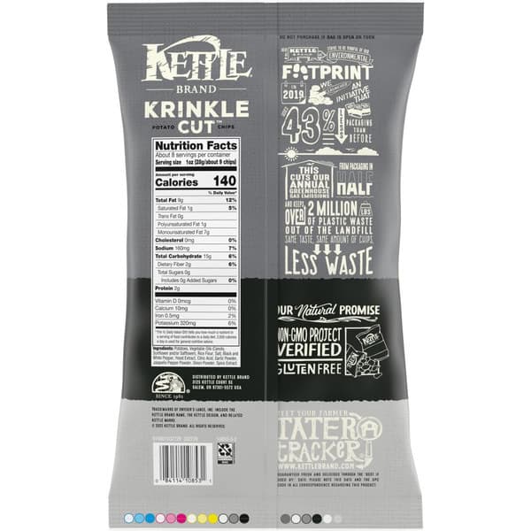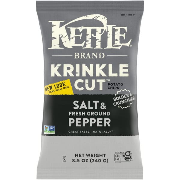Kettle Brand Krinkle Cut Salt & Ground Pepper kettle chips are sliced thicker than our classic kettle chips for an extra crunch. And their deep ridges hold all the extreme seasoning they need. Each potato chip is sprinkled with a much-loved combo: a kiss of salt and the kick of ground pepper. On top of that, they follow Our Natural Promise to be Non-GMO Project Verified and Certified Gluten-Free. So go ahead, experience the enjoyment straight out of the bag. It takes pretty high standards to achieve Kettle Brand chips’ amazing crunch and flavor. Kettle Brand chips always deliver on taste because they’re made from quality ingredients and the perfect blend of seasonings. When you open a bag of Kettle Brand Krinkle Cut potato chips, you know you’re getting incredible quality made with authentic recipes by real people who take real care with what they do. You can share this 8.5 ounce bag of chips with a friend, but we won’t blame you for keeping it to yourself. Kettle Brand potato chips. Kettle Brand Krinkle Cut potato chips. Extra in a good way.