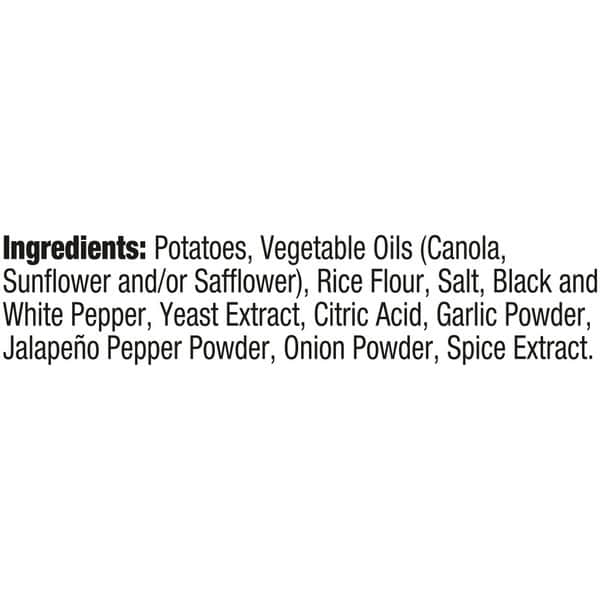 Potatoes, Vegetable Oils (canola, Sunflower And/or Safflower), Rice Flour, Salt, Black And White Pepper, Yeast Extract, Citric Acid, Garlic Powder, Jalapeño Pepper Powder, Onion Powder, Spice Extract