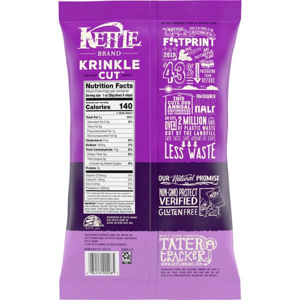 Kettle Brand Krinkle Cut Truffle Oil & Sea Salt chips are sliced thicker than our classic kettle chips for an extra crunch. And their deep ridges hold the extreme seasoning they deserve. This Truffle Oil & Sea Salt flavor delivers a true taste adventure with an earthy, oaky, and downright decadent taste. On top of that, they follow Our Natural Promise to be Non-GMO Project Verified and Certified Gluten-Free. So go ahead, experience the power of the crunch and the rich umami flavor by eating them straight out of the bag. It takes pretty high standards to achieve Kettle Brand chips’ amazing crunch and flavor – quality ingredients make a difference. When you open a bag of Kettle Brand Krinkle Cut potato chips, you know you’re getting incredible quality made with authentic recipes by real people who take real care with what they do. These 7.5-ounce bags of chips are perfect for sharing with friends or just snacking on the couch. Do yourself a flavor favor and try Truffle Oil & Sea Salt chips. Kettle Brand potato chips. Extra in a good way.