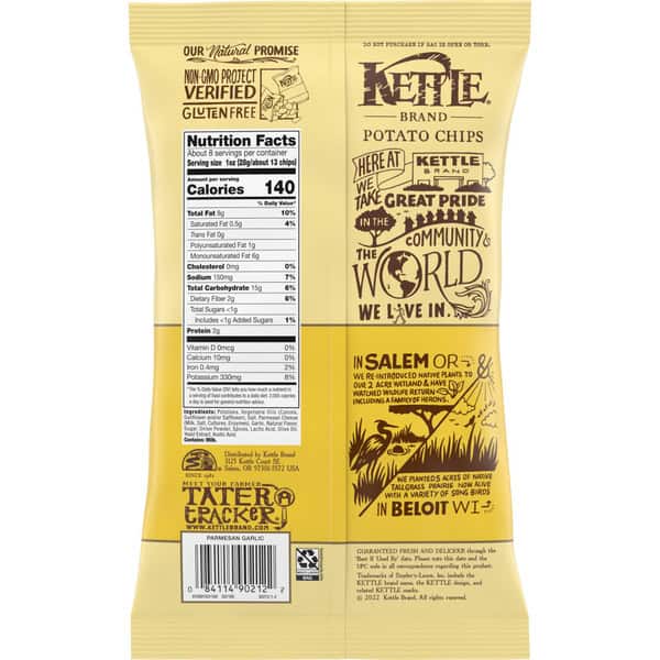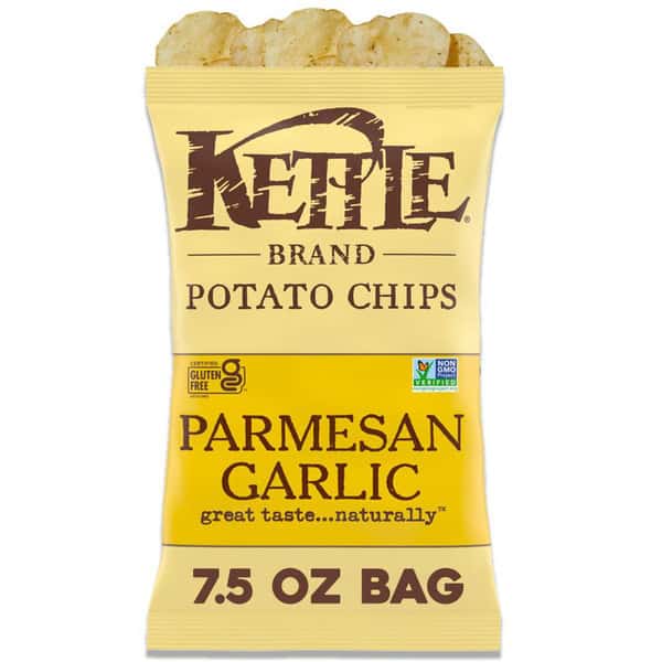 Kettle Brand Parmesan Garlic kettle chips start with a search for undisputed potato excellence. Determined not to disrupt the flawless, spudsy goodness, these beauties are kettle cooked, skin on, one batch at a time. Crispy and crunchy. Garlicky and cheesy. Kettle Brand Parmesan Garlic chips take the goodness of a whole potato, perfectly sliced, cooked to golden perfection, and add the bold taste of parmesan and garlic for undeniable flavor and crunch. When you open a bag of our Kettle Brand potato chips, you know you’re getting incredible kettle chips made with authentic recipes by real people. From their farms to our kitchens and then to your home, the time and attention every Kettle Brand worker puts into their products is care you can trust. All that, plus Kettle Brand chips deliver a delicious snack that’s non-GMO Project Verified, and Certified Gluten-Free. This large 7.5-ounce bag of chips is perfect for sharing at parties, picnics, or just snacking on the couch. Kettle Brand potato chips. Extra in a good way.