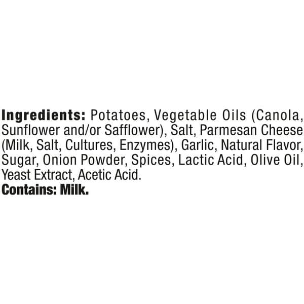Potatoes, Vegetable Oils (canola, Sunflower And/or Safflower), Salt, Parmesan Cheese (milk, Salt, Cultures, Enzymes), Garlic, Natural Flavor, Sugar, Onion Powder, Spices, Lactic Acid, Olive Oil, Yeast Extract, Acetic Acid