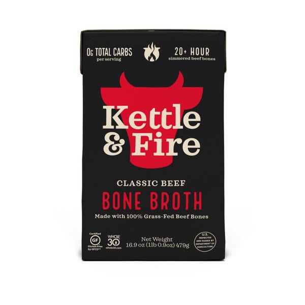 No preservatives. At Kettle & Fire, we’re not just making good food. We’re making it our mission to improve the way we eat, starting from the ground up. It’s why we partner with farms that reflect our core values, why we carefully source our ingredients, and why we slow simmer our bones at the perfect temperatures. From our people to our packaging, we believe every step of our process is another opportunity to do things better. We’re committed to making positive changes in our food system – and we hope you’ll join us. Classic Beef: The one that started it all. Our very first brew is still a fan favorite! With grass-fed beef bones, savory vegetables, and fragrant herbs, this slow-simmered sip is sure to make you smile. Please recycle.