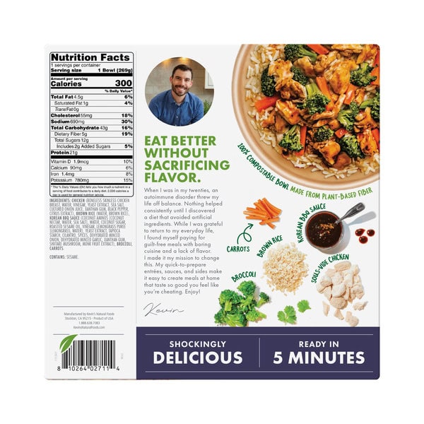 Chicken (boneless Skinless Chicken Breast, Water, Vinegar, Yeast Extract, Sea Salt, Cultured Onion Juice, Xanthan Gum, Black Pepper, Citrus Extract), Brown Rice (water, Brown Rice), Korean Bbq Sauce (coconut Aminos [coconut Nectar, Water, Sea Salt], Water, Coconut Sugar, Roasted Sesame Oil, Vinegar, Lemongrass Puree [lemongrass, Water], Yeast Extract, Cilantro, Spices, Dehydrated Minced Onion, Tapioca Starch, Dehydrated Minced Garlic, Xanthan Gum, Shiitake Mushroom, Monk Fruit Extract), Broccoli, Carrots.
