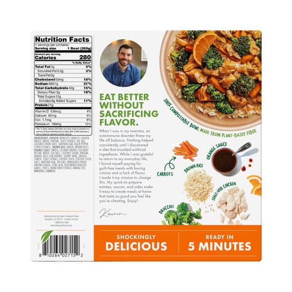 Chicken (boneless Skinless Chicken Breast, Water, Vinegar, Yeast Extract, Sea Salt, Cultured Onion Juice, Xanthan Gum, Black Pepper, Citrus Extract), Brown Rice (water, Brown Rice), Orange Sauce (water Coconut Aminos [coconut Nectar, Water, Sea Salt], Coconut Sugar, Vinegar, Orange Juice Concentrate, Sherry Wine, Yeast Extract Chicken Stock [chicken Stock, Salt], Tapioca Starch, Xanthan Gum, Sea Salt, Granulated Onion, Ground Ginger, Citric Acid, Dehydrated Roasted Garlic, Chiles, Monk Fruit Extract, Orange Oil), Broccoli, Carrots.